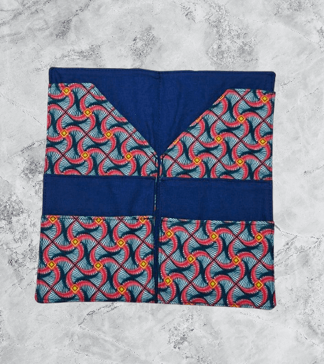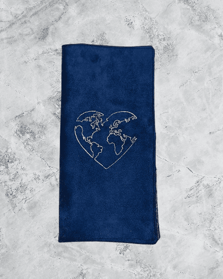 Elle est confectionnée pour l'exterieur de suédine bleu marine brodée et pour l'interieur de coton imprimé et uni.